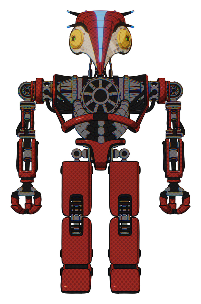 Automaton containing bird skull head and brass steampunk eyes and head shield design and heavy upper chest and no chest plating and prototype exoplate legs. Cherry tomato red. Front view.