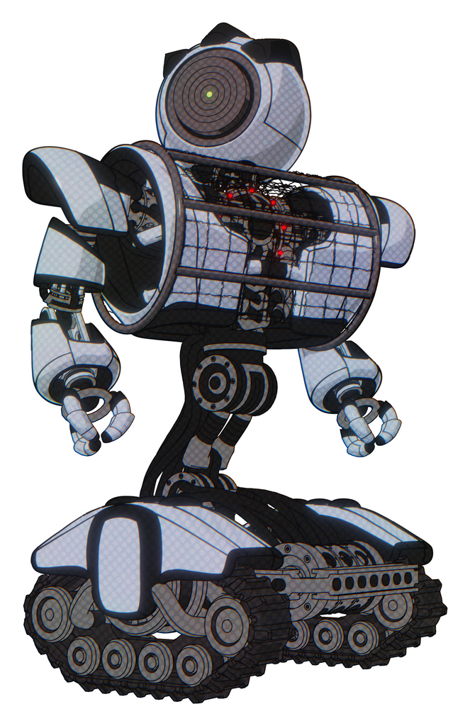 Automaton containing green dot eye corn row plastic hair and heavy upper chest and heavy mech chest and barbed wire chest armor cage and tank tracks. Blue tint toon. Hero pose.