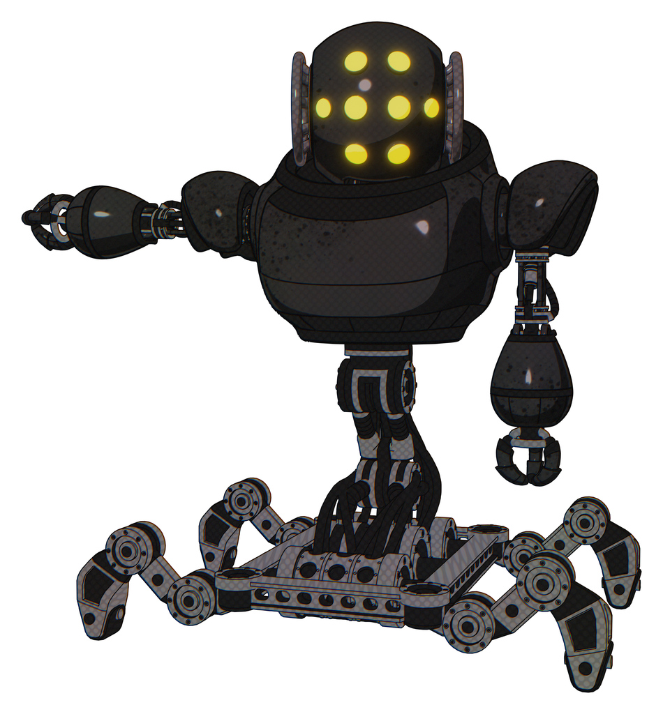 Droid containing round head and yellow eyes array and heavy upper chest and insect walker legs. Dirty black. Arm out holding invisible object..