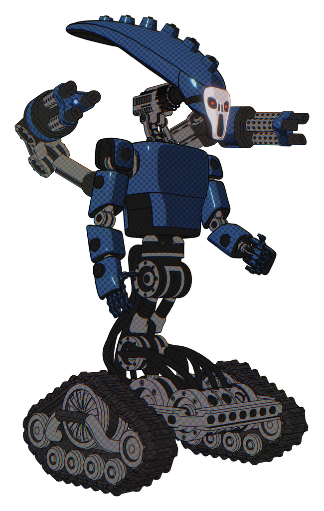 Cyborg containing flat elongated skull head and light chest exoshielding and prototype exoplate chest and minigun back assembly and tank tracks. Dark blue halftone. Facing left view.