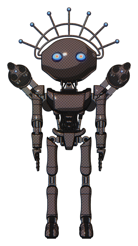 Cyborg containing elements: oval wide head, blue eyes, techno halo ornament, light chest exoshielding, ultralight chest exosuit, minigun back assembly, ultralight foot exosuit. Material: Light brown.