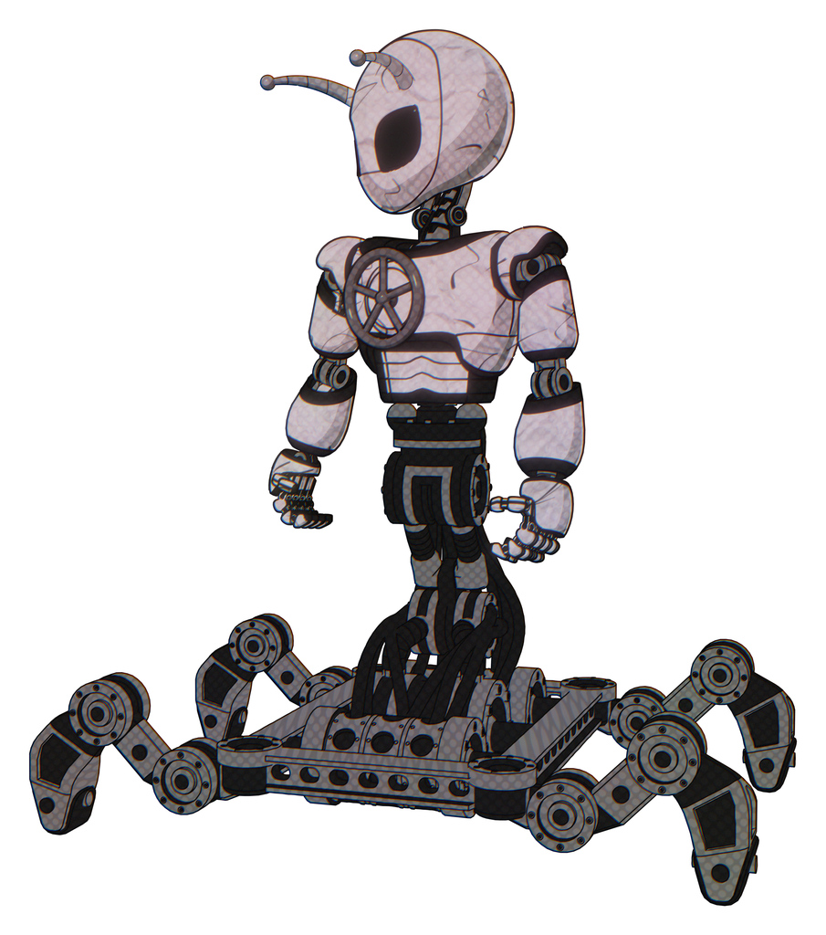 Bot containing grey alien style head and black eyes and bug antennas and light chest exoshielding and chest valve crank and insect walker legs. Sketch pad doodle lines.