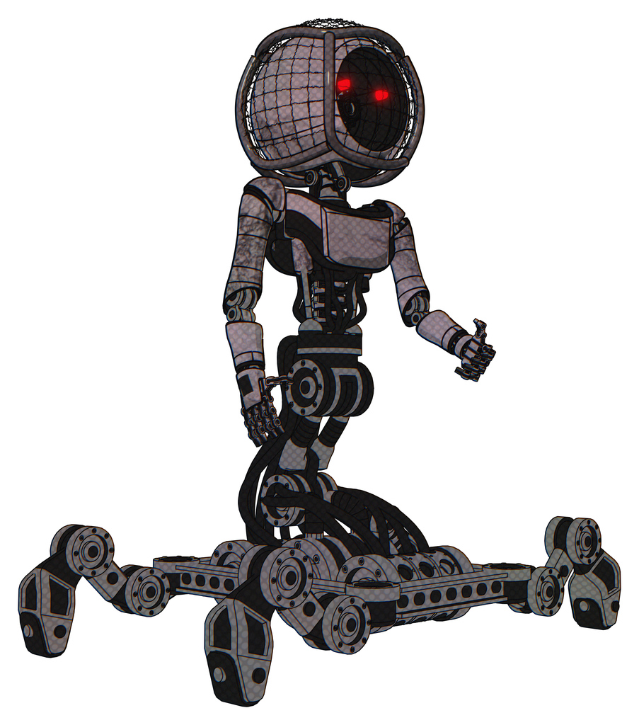 Automaton containing round barbed wire round head and light chest exoshielding and ultralight chest exosuit and insect walker legs. Dark dirty scrawl sketch. Facing left view.