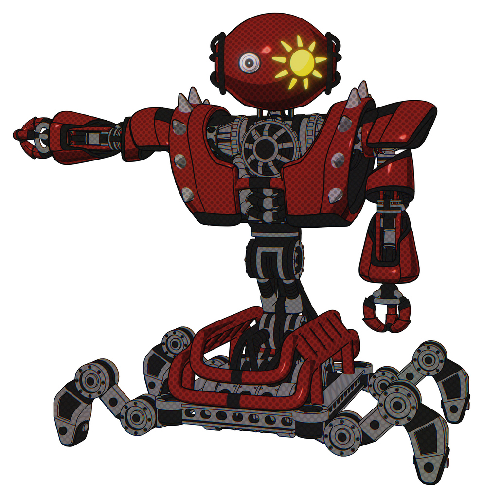 Robot containing oval wide head and sunshine patch eye and heavy upper chest and heavy mech chest and shoulder spikes and insect walker legs. Matted red. Arm out holding invisible object..