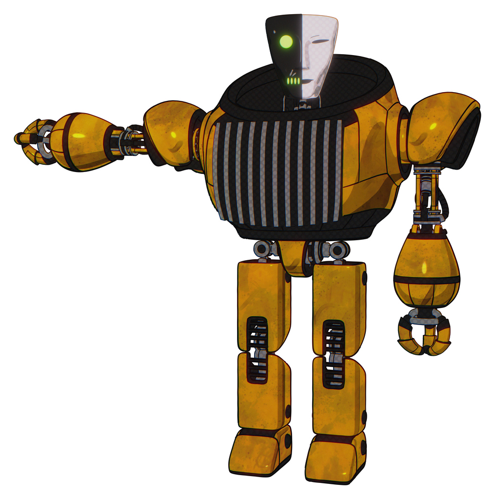 Automaton containing humanoid face mask and two-face black white mask and heavy upper chest and chest vents and prototype exoplate legs. Worn construction yellow. Arm out holding invisible object..