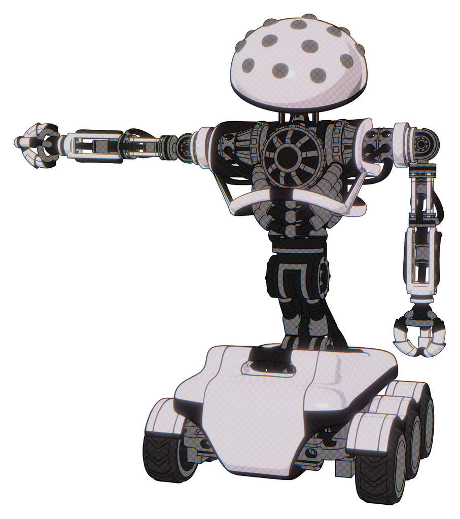 Mech containing metal knucklehead design and heavy upper chest and no chest plating and six-wheeler base. White halftone toon. Arm out holding invisible object..