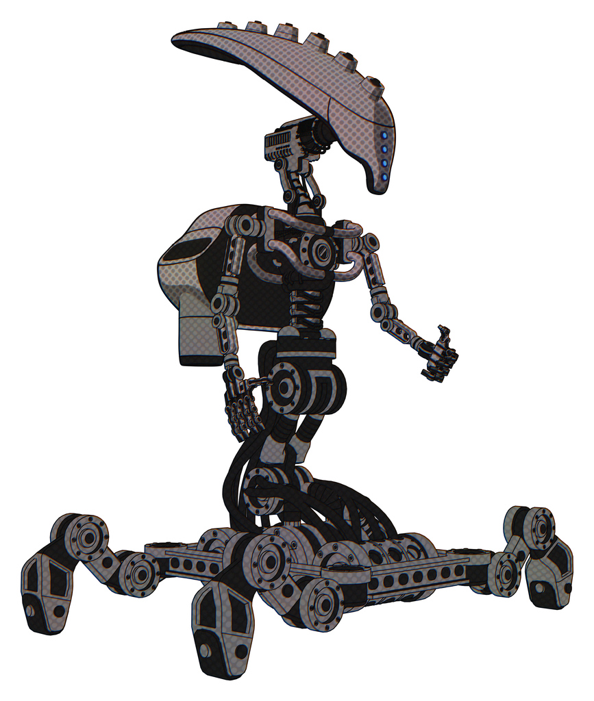 Droid containing flat elongated skull head and light chest exoshielding and rocket pack and no chest plating and insect walker legs. Halftone gray. Facing left view.