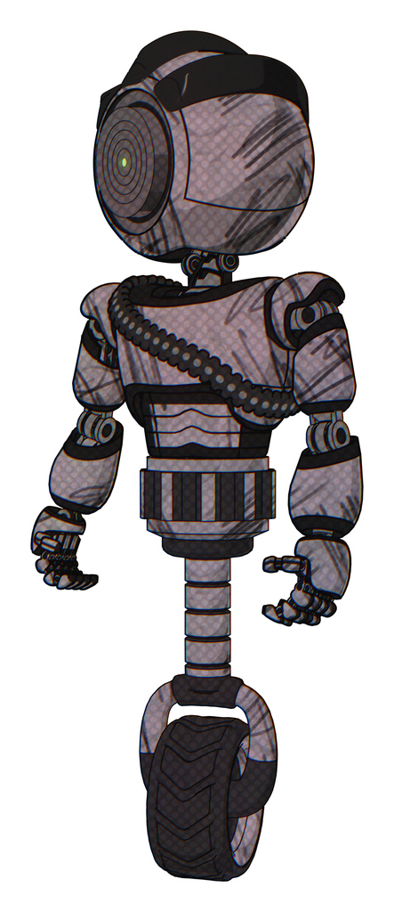 Mech containing green dot eye corn row plastic hair and light chest exoshielding and rubber chain sash and unicycle wheel. Dark sketchy. Standing looking right restful pose.