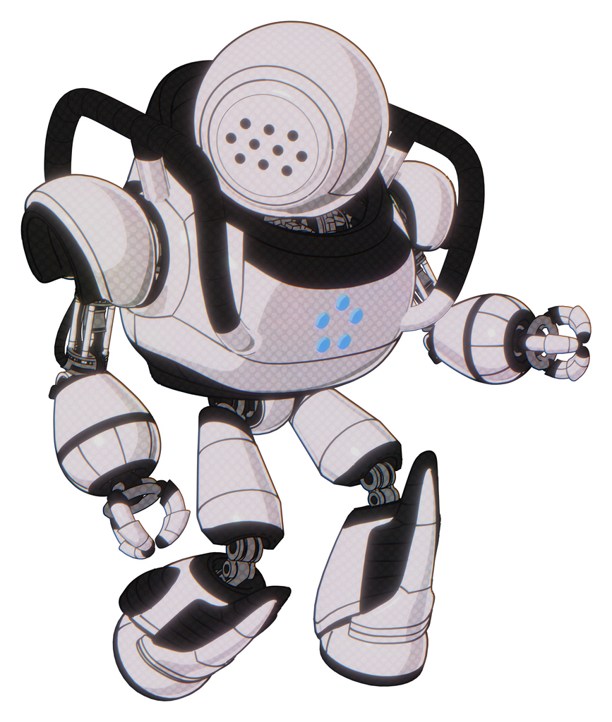 Bot containing dots array face and heavy upper chest and circle of blue leds and light leg exoshielding and stomper foot mod. White halftone toon. Fight or defense pose..