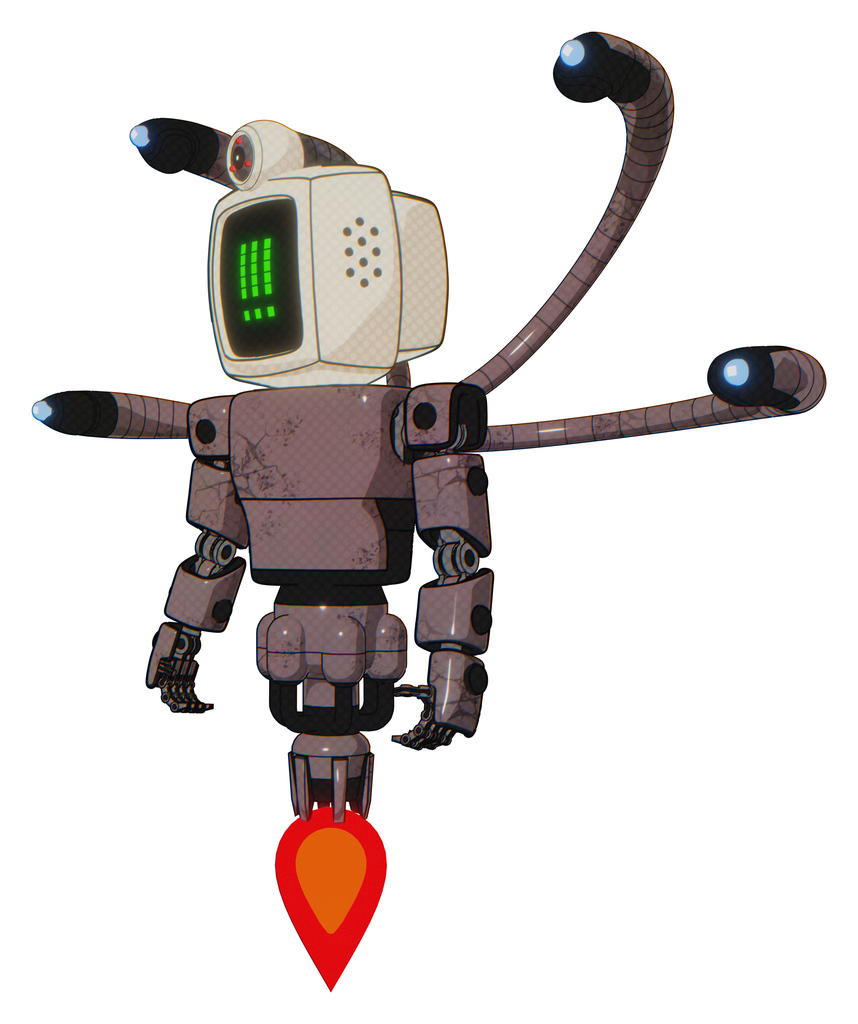Mech containing old computer monitor and pixel exclamation point alert face and retro-futuristic webcam and light chest exoshielding and prototype exoplate chest .