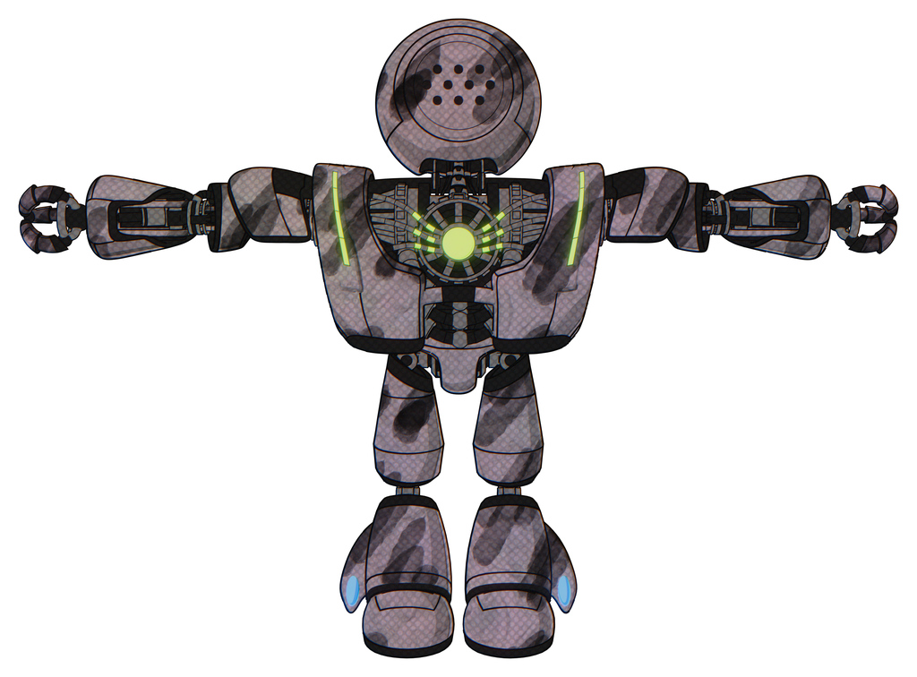 Bot containing dots array face and heavy upper chest and heavy mech chest and green energy core and light leg exoshielding. Sketch pad wet ink smudge. T-pose.