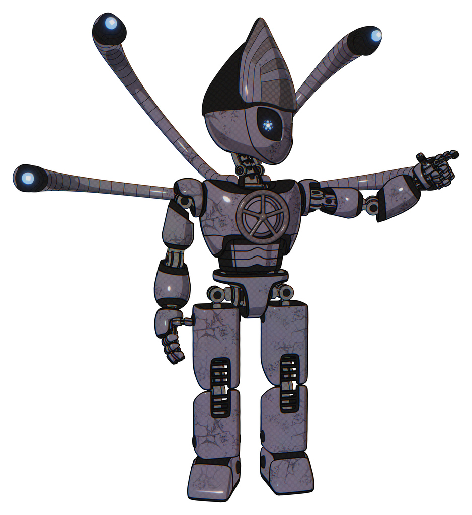 Bot containing grey alien style head and electric eyes and light chest exoshielding and chest valve crank and blue-eye cam cable tentacles and prototype exoplate legs. Light lavender metal.