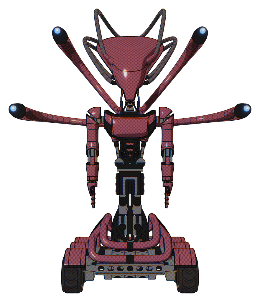 Cyborg containing flat elongated skull head and cables and light chest exoshielding and ultralight chest exosuit and blue-eye cam cable tentacles and six-wheeler base. Muavewood halftone. Front view.