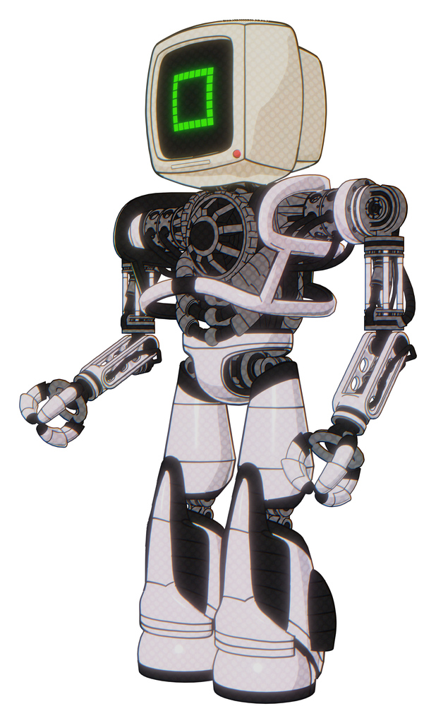 Automaton containing old computer monitor and pixel square design and heavy upper chest and no chest plating and light leg exoshielding and stomper foot mod. White halftone toon. Facing right view.