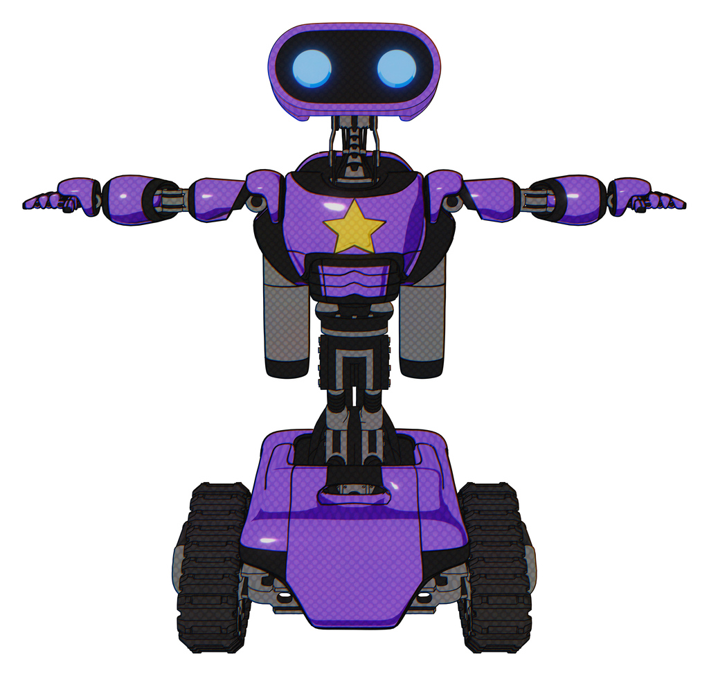 Droid containing dual retro camera head and cute retro robo head and light chest exoshielding and yellow star and rocket pack and tank tracks. Secondary purple halftone. T-pose.