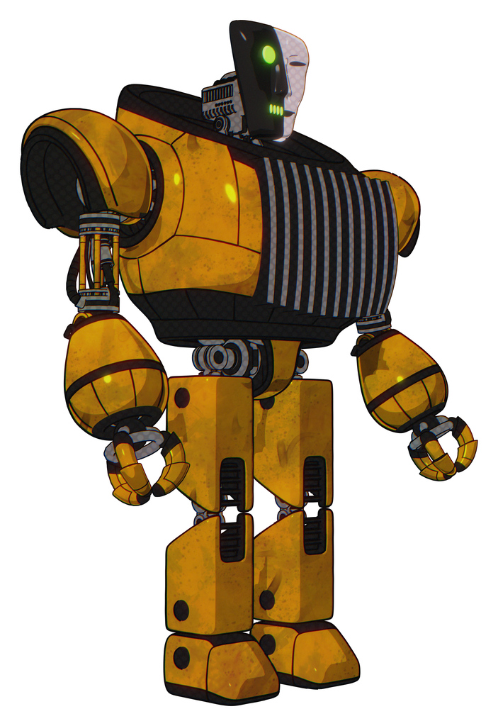 Automaton containing humanoid face mask and two-face black white mask and heavy upper chest and chest vents and prototype exoplate legs. Worn construction yellow. Facing left view.