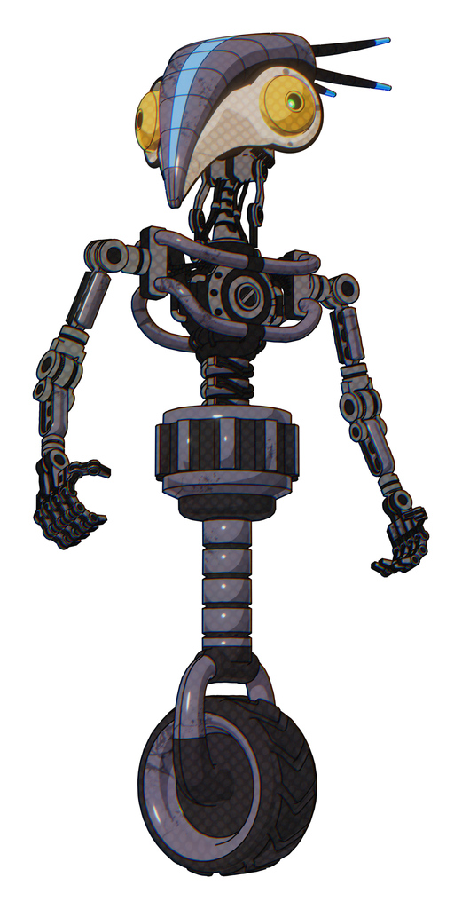 Automaton containing bird skull head and brass steampunk eyes and head shield design and light chest exoshielding and no chest plating and unicycle wheel. Light lavender metal. Hero pose.