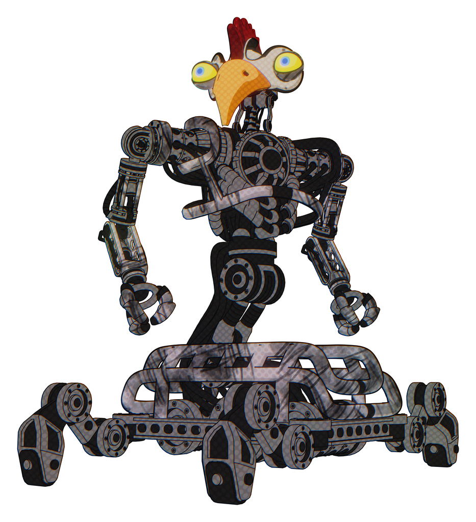 Robot containing bird skull head and big yellow eyes and chicken design and heavy upper chest and no chest plating and insect walker legs. Scribble sketch. Hero pose.