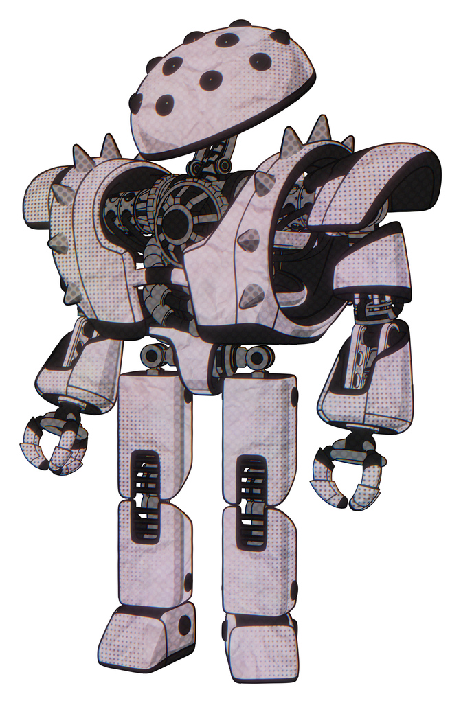 Robot containing black sphere cam design and heavy upper chest and heavy mech chest and shoulder spikes and prototype exoplate legs. Sketch pad dots pattern. Standing looking right restful pose.