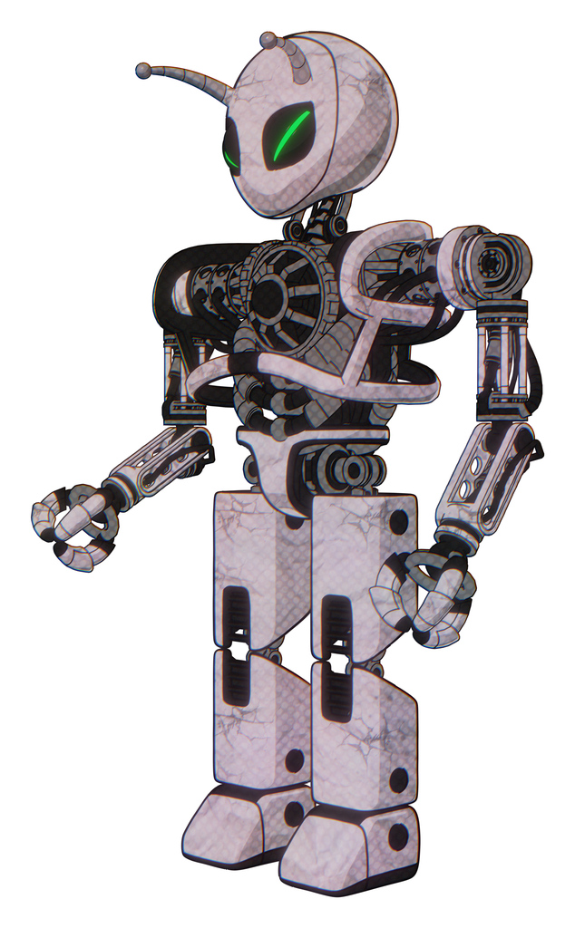 Mech containing grey alien style head and green demon eyes and bug antennas and heavy upper chest and no chest plating and prototype exoplate legs. Sketch pad light. Facing right view.