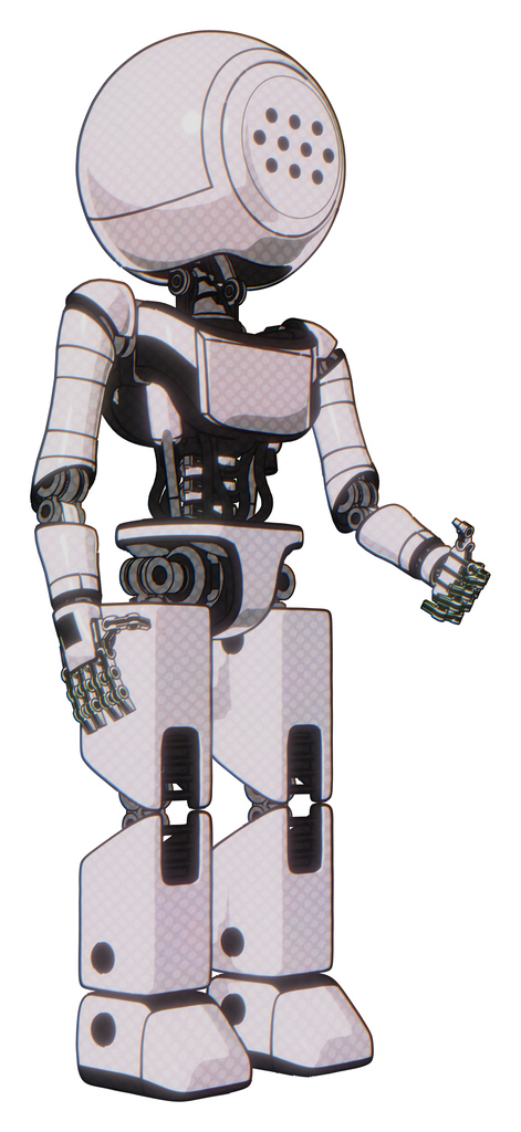 Automaton containing dots array face and light chest exoshielding and ultralight chest exosuit and prototype exoplate legs. White halftone toon. Facing left view.