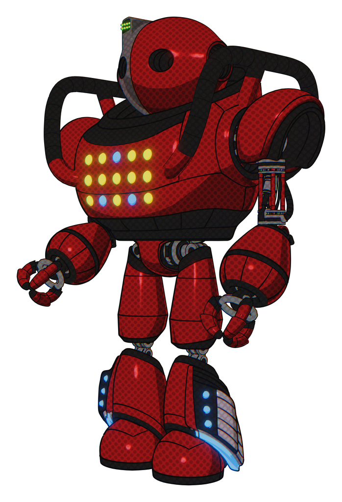 Automaton containing oval wide head and green led ornament and heavy upper chest and colored lights array and light leg exoshielding and megneto-hovers foot mod. Dark red. Facing right view.