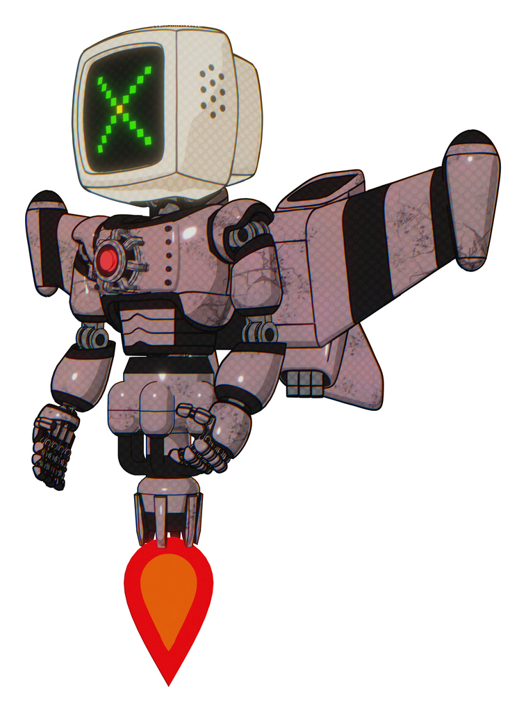 Mech containing elements: old computer monitor, pixel x, light chest exoshielding, red energy core, stellar jet wing rocket pack, jet propulsion. Material: Grayish pink. Situation: Facing right view.