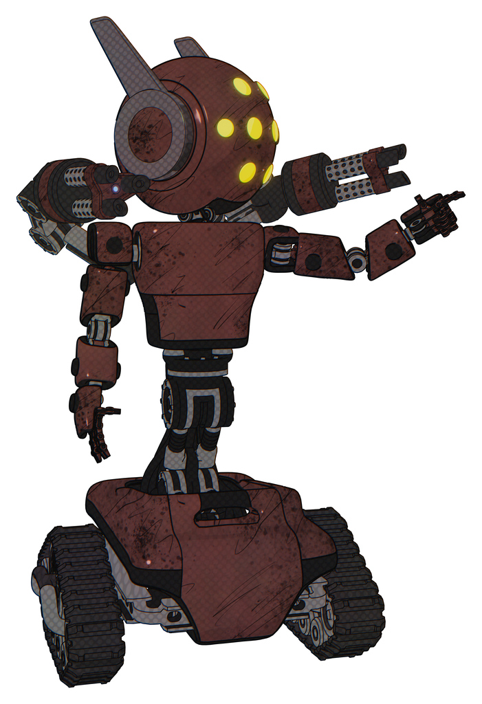Droid containing round head and yellow eyes array and head winglets and light chest exoshielding and prototype exoplate chest and minigun back assembly and tank tracks. Steampunk copper.
