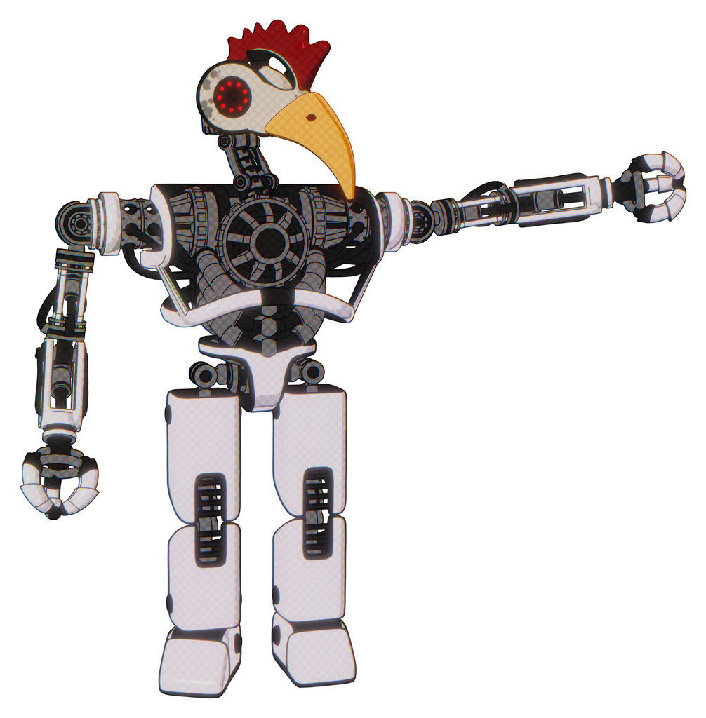 Robot containing bird skull head and red led circle eyes and chicken design and heavy upper chest and no chest plating and prototype exoplate legs. White halftone toon.