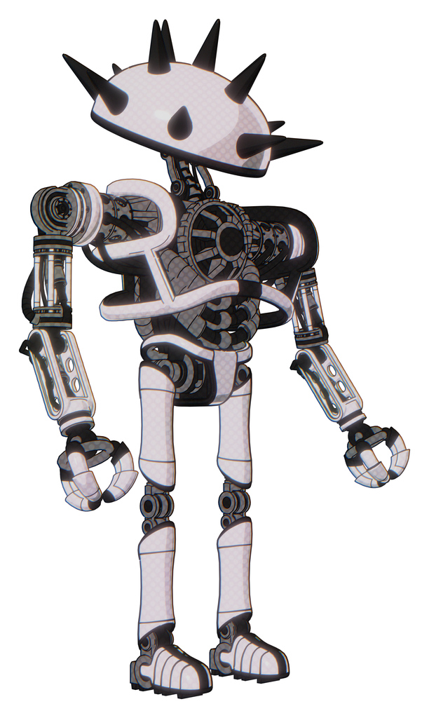 Automaton containing thorny domehead design and heavy upper chest and no chest plating and ultralight foot exosuit. White halftone toon. Facing left view.