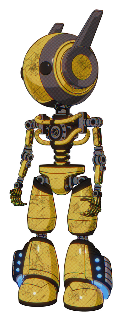 Cyborg containing round head and maru eyes and head winglets and light chest exoshielding and no chest plating and light leg exoshielding and megneto-hovers foot mod. Construction yellow halftone.