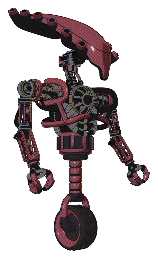 Robot containing flat elongated skull head and heavy upper chest and no chest plating and unicycle wheel. Muavewood halftone. Facing left view.