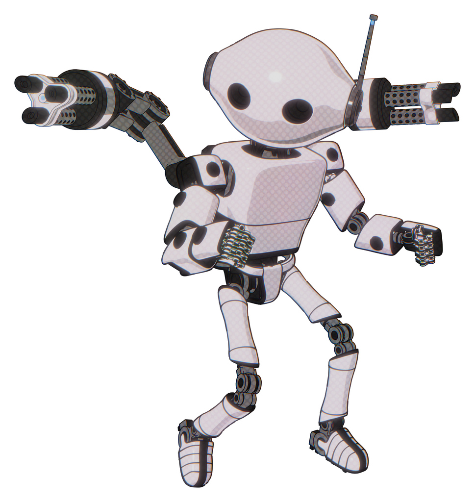 Robot containing elements: oval wide head, retro antenna with light, light chest exoshielding, prototype exoplate chest, minigun back assembly, ultralight foot exosuit. Material: White halftone toon.