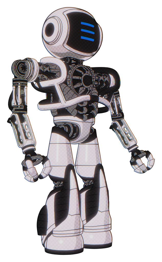Droid containing digital display head and three horizontal line design and heavy upper chest and no chest plating and light leg exoshielding and stomper foot mod. White halftone toon.