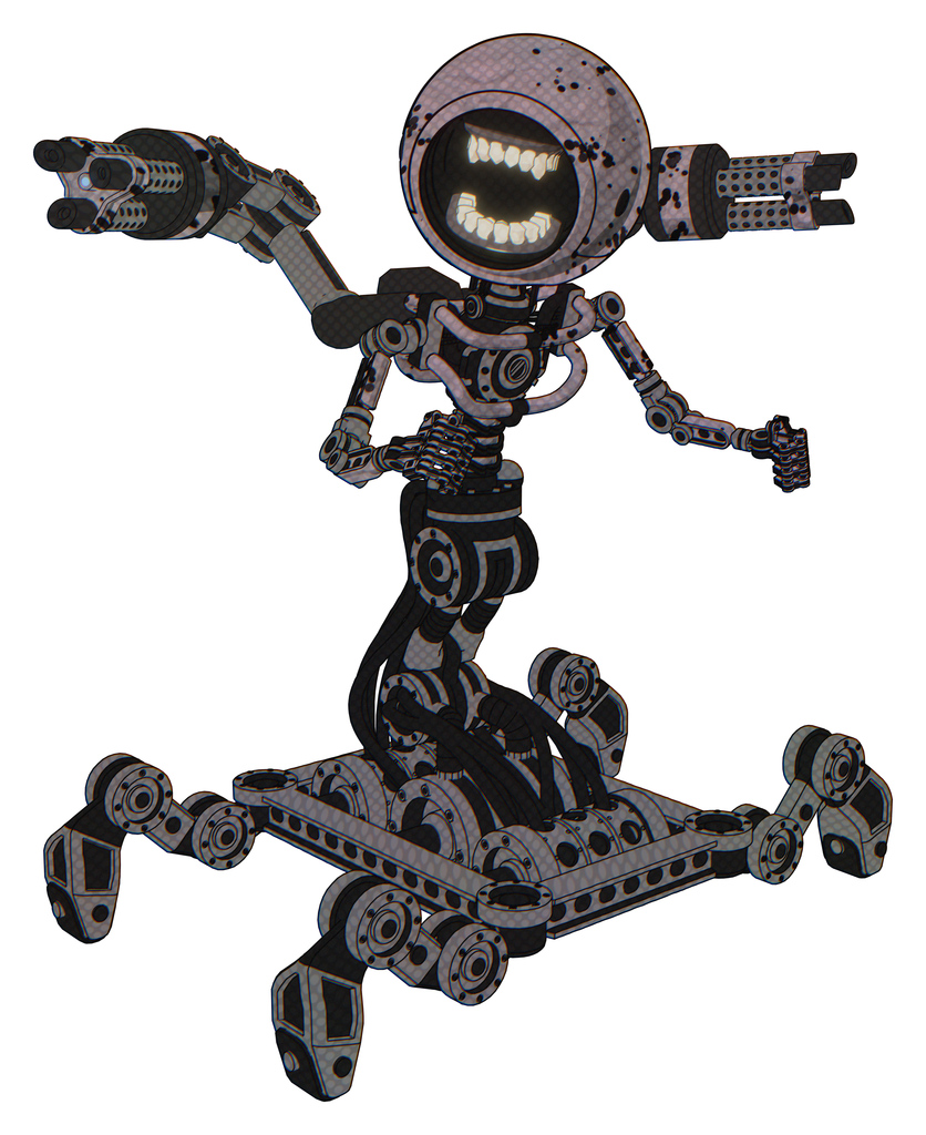 Droid containing round head chomper design and light chest exoshielding and minigun back assembly and no chest plating and insect walker legs. Dark ink dots sketch. Fight or defense pose..