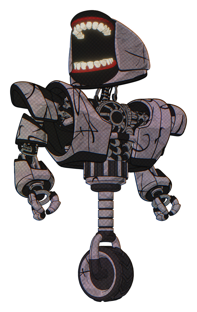 Robot containing chomper head design and heavy upper chest and heavy mech chest and unicycle wheel. Dark sketch doodle. Hero pose.