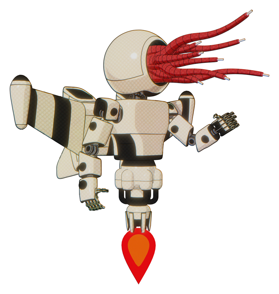 Automaton containing bright red jellyfish tentacles fiber optic design and light chest exoshielding and prototype exoplate chest and stellar jet wing rocket pack and jet propulsion. Off white toon.