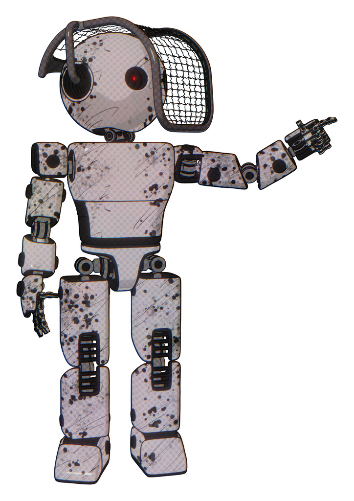 Mech containing elements: oval wide head, small red led eyes, barbed wire visor helmet, light chest exoshielding, prototype exoplate chest, prototype exoplate legs. Material: Grunge sketch dots.