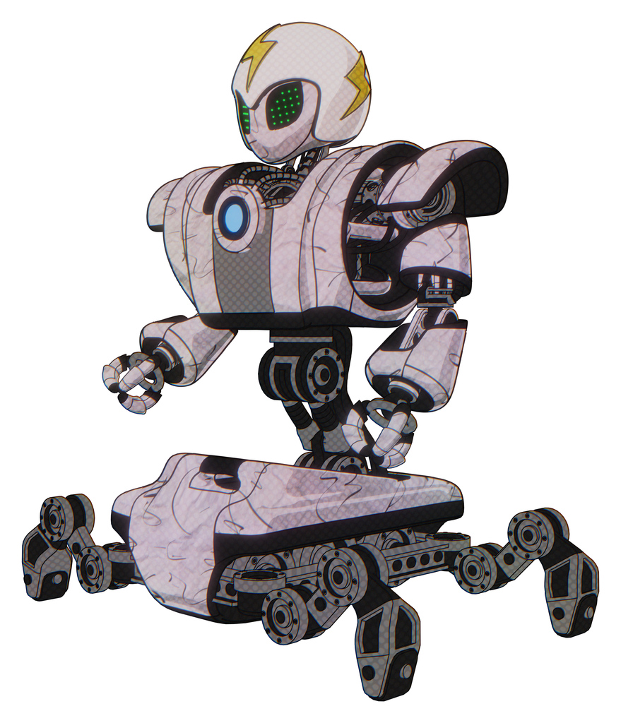 Robot containing grey alien style head and led array eyes and lightning bolts and helmet and heavy upper chest and heavy mech chest and blue energy fission element chest and insect walker legs.