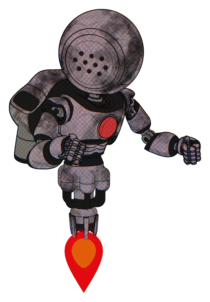 Mech containing dots array face and light chest exoshielding and red chest button and rocket pack and jet propulsion. Sketch pad cloudy smudges. Fight or defense pose..