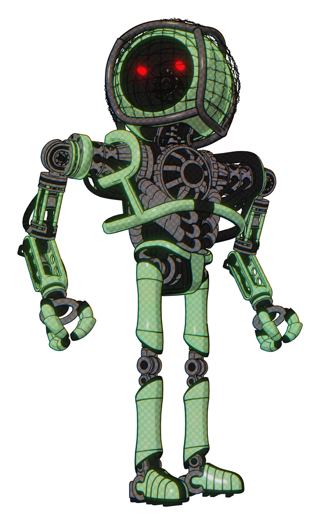 Robot containing round barbed wire round head and heavy upper chest and no chest plating and ultralight foot exosuit. Green tint toon. Hero pose.
