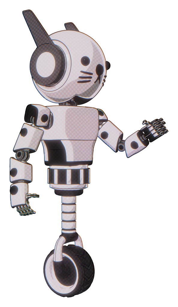 Bot containing round head and head winglets and light chest exoshielding and prototype exoplate chest and unicycle wheel and cat face. White halftone toon. Interacting.