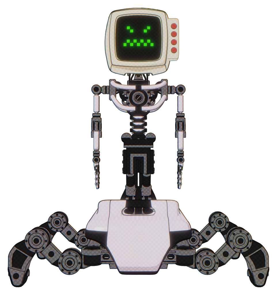 Mech containing old computer monitor and angry pixels face and red buttons and light chest exoshielding and no chest plating and insect walker legs. White halftone toon. Front view.