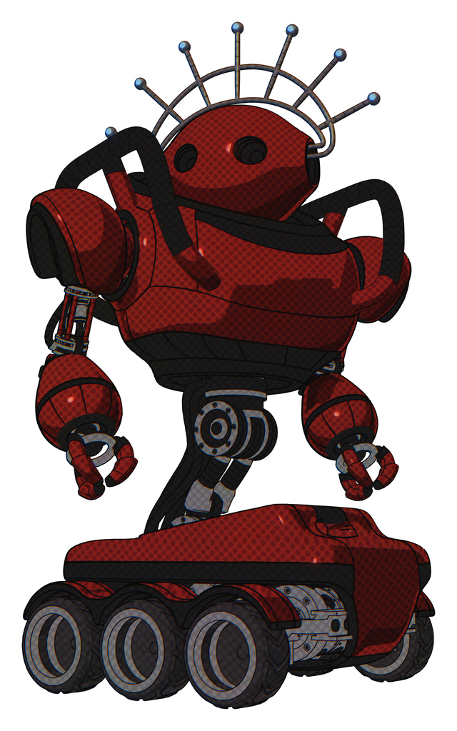 Bot containing oval wide head and techno halo ornament and heavy upper chest and six-wheeler base. Matted red. Hero pose.