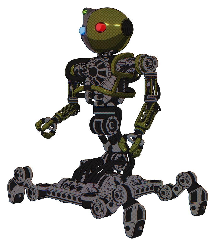 Mech containing oval wide head and giant blue and red led eyes and green led ornament and heavy upper chest and no chest plating and insect walker legs. Army green halftone. Facing right view.
