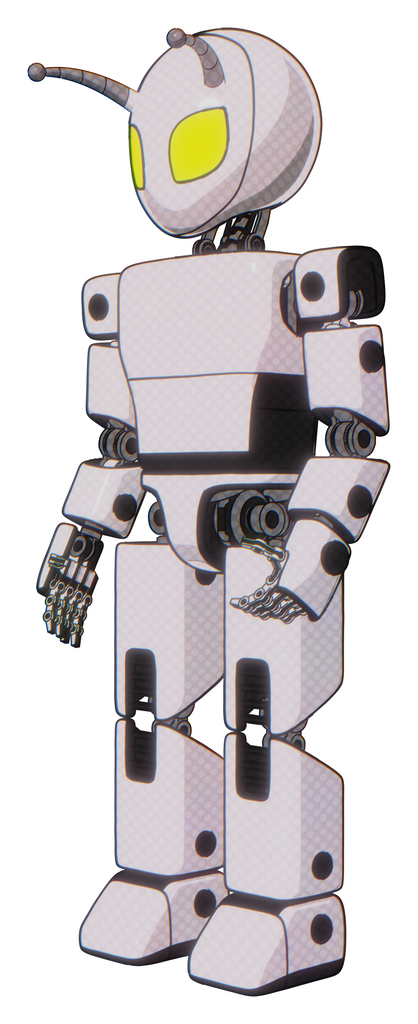 Droid containing grey alien style head and yellow eyes and bug antennas and light chest exoshielding and prototype exoplate chest and prototype exoplate legs. White halftone toon. Facing right view.