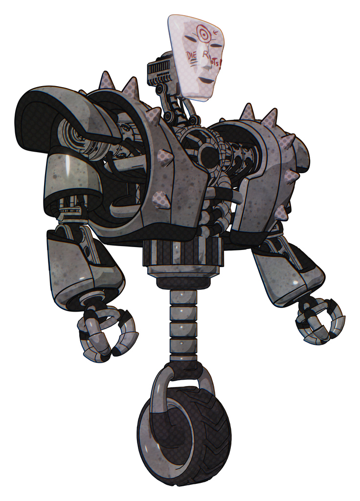 Automaton containing humanoid face mask and die robots graffiti design and heavy upper chest and heavy mech chest and shoulder spikes and unicycle wheel. Unpainted metal. Facing left view.