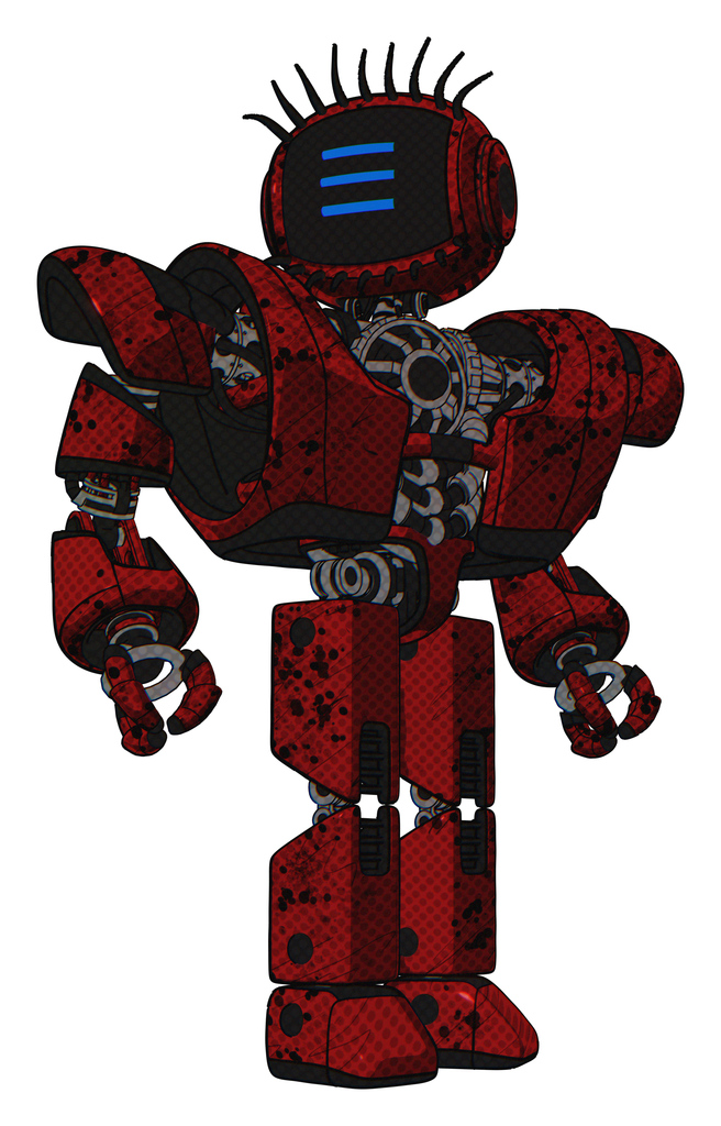Droid containing digital display head and three horizontal line design and eye lashes deco and heavy upper chest and heavy mech chest and prototype exoplate legs. Grunge dots dark red. Hero pose.