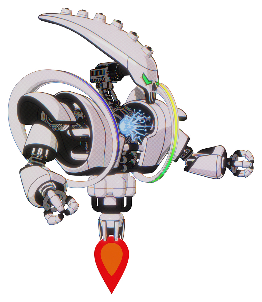 Cyborg containing flat elongated skull head and heavy upper chest and heavy mech chest and spectrum fusion core chest and jet propulsion. White halftone toon. Interacting.