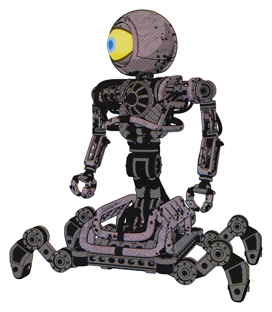 Cyborg containing giant eyeball head design and heavy upper chest and no chest plating and insect walker legs. Dark ink dots sketch. Standing looking right restful pose.